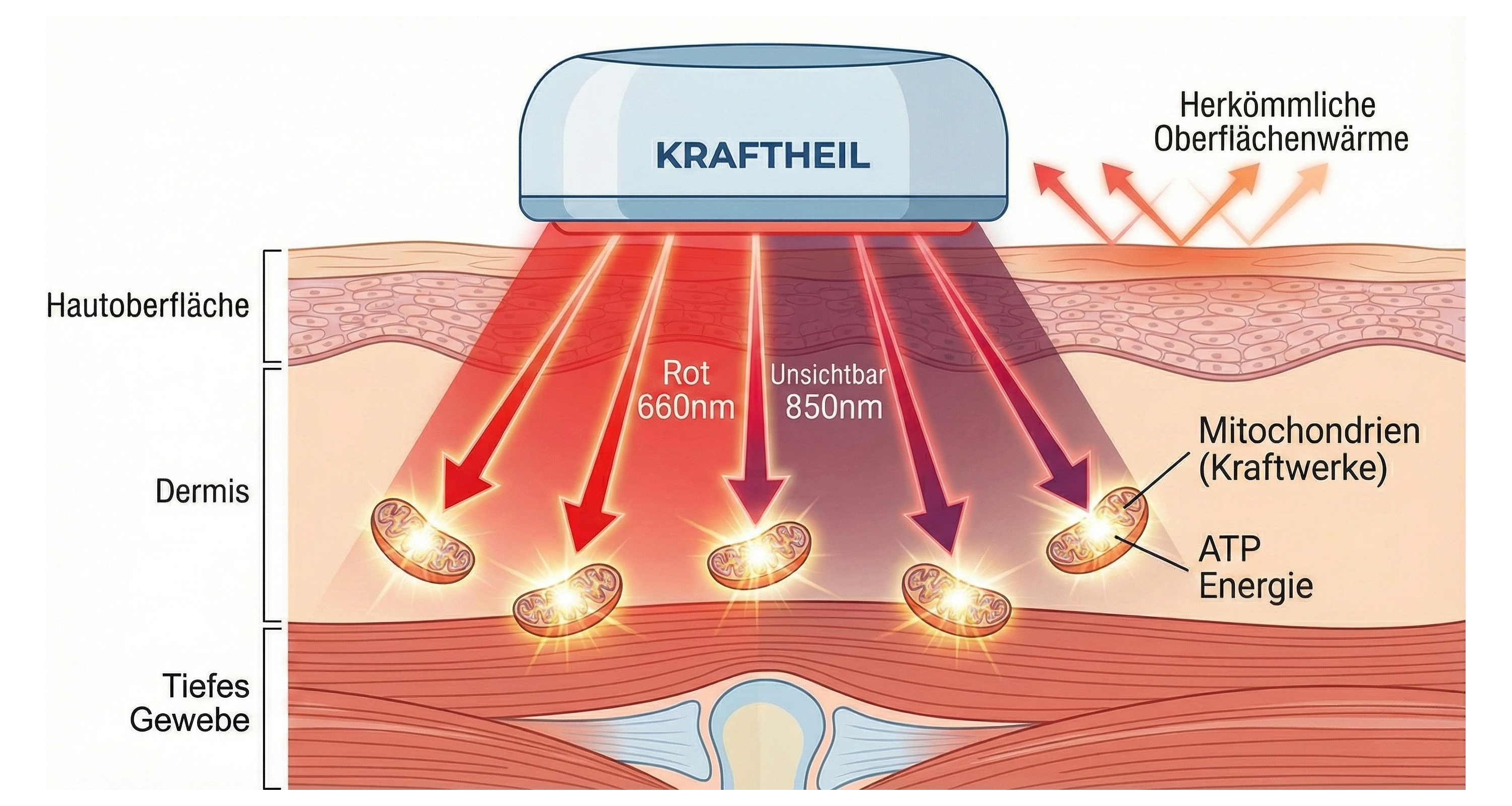 Ihre Sicherheit hat oberste Priorität. Der KRAFTHEIL Gürtel nutzt Lichtenergie, keine direkte Hitze wie ein Heizkissen. Er verfügt über eine intelligente Abschaltautomatik und Überhitzungsschutz. Das Licht ist 100% UV-frei und sicher für die Haut bei täglicher Anwendung.